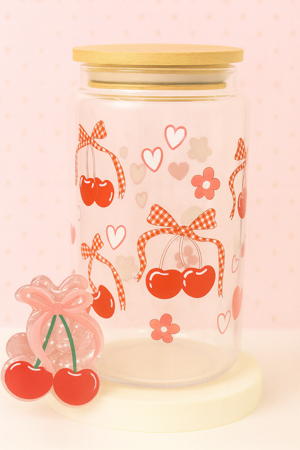 Glass Tumbler with straw, straw cleaner and cherry hair clip.